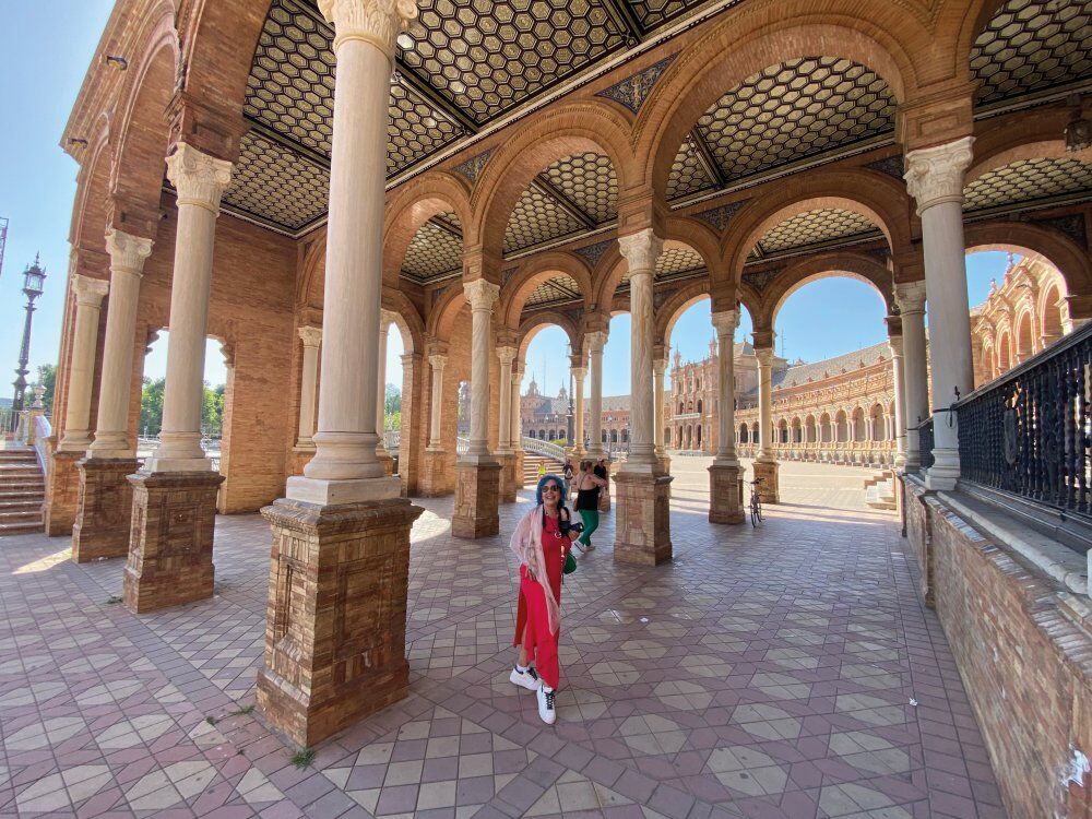 Sevilla şehrinde bulunan Plaza de Espana’nın mimarisi ile İspanya’nın en güzel meydanı olduğunu söyleyebilirim. 1929 yılında İspanya ile Latin Amerika ülkeleri arasındaki ilişkileri geliştirmek için düzenlenen İbero-Amerikan Expo Fuarı için yapılmış. Hilal şeklindeki yapının etrafında 515 metre uzunluğunda bir kanal bulunması sebebiyle Endülüs’ün Venedik’i denmektedir. Kanal boyunca küçük sandallarla gezilebilir. Sütunlu galeriler, çini işlemeler ve kemerli yapıları ile görülmeye değer. Yapının cephesinde kullanılan harika seramikler Endülüs’ün geleneksel el sanatları ile bezenmiş. Meydanın duvarlarında İspanya’nın 48 ili için ayrı ayrı yapılmış, her ilin tarihi bir olayını temsil eden çini panolar bulunmaktadır. Bu panolar aynı zamanda bank şeklinde ve üzerine oturabiliyorsunuz. Fotoğraf çekerken kulağımıza hoş gelen f lamenko müziğine doğru yürüyünce harika bir flamenko gösterisine denk geliyoruz. Bu güzel mekanda bu gösteriyi seyredebilmek hoş bir sürpriz oldu bizim için.
