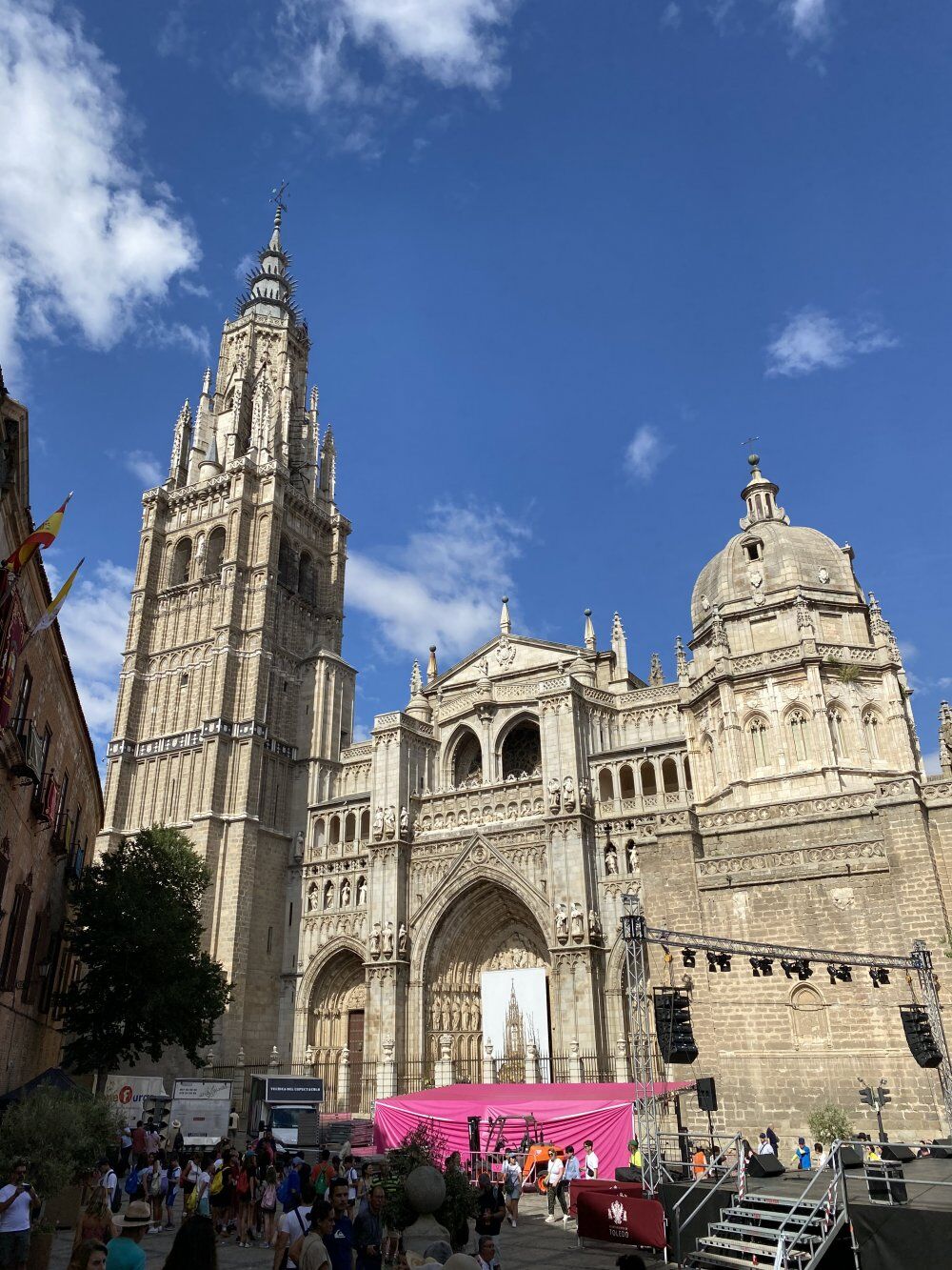 Her yıl Paskalya’dan sekiz hafta sonra, Toledo’da bir haftalık Corpus Christi Bayramı kutlamaları başlarmış. Corpus Christi bayramı İsa’nın gerçek bedeninin ekmek şeklinde insanlara sunulmasını anmak için. Bu yıl 27 Mayıs’ta başlayıp 2 Haziran’a kadar devam edecekmiş. Bizim 30 mayıs tarihinde Toledo’da olmamız büyük şans. Şehir, tenteler, çiçekler ve çelenkler ile süslenmiş. Her yıl müzik grupları eşliğinde renkli bir geçit töreni düzenlenmektedir. Geleneksel olarak tören meydanının zeminine biberiye, lavanta ve nane gibi aromatik bitkiler serilir. Saat 11:00 civarında katedralden başlayan Custodia de Arfe adlı muhteşem altın-gümüş monstrans (160 kg 16.yüzyıl eseri) simgesel geçitle şehri dolaştırılır. Geç Gotik mimari tarzında çok katlı ve detaylı bir kule gibi yapılmıştır. Yüksekliği yaklaşık 2.5 metre kadardır. Üst kısmında yer alan küçük altın bölümde kutsal kabul edilen kutsanmış ekmek taşınır. Bu Katolik inancına göre İsa’nın vücudunu simgeler. Askeri akademiden gelen öğrenciler ve dini kardeşlikler eşlik eder; halk saygıyla eğilir. alkışlarla ilerlerler. Geçit törenini göremesekte şehri böyle süslenmiş görmek bir ayrıcalıktı doğrusu.