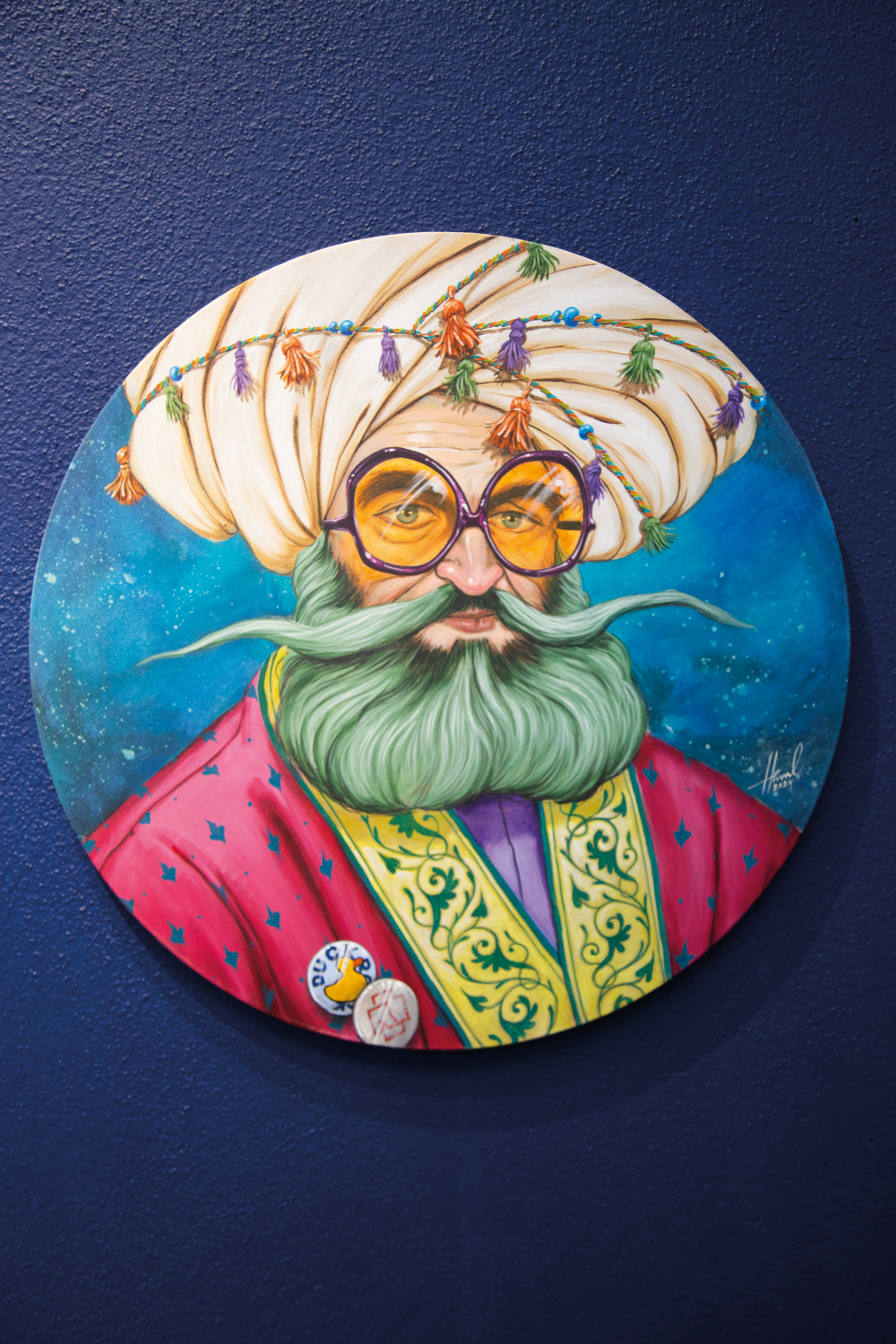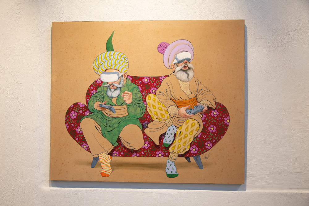 İlk bakışta geleneksel bir sanat dili görüyorsunuz ama detaylarda bir zaman yolculuğu başlıyor; bugüne geliyor, bazen geleceğe uzanıyor. Geçmiş ile gelecek arasında bir denge kurmaya çalışıyorum. Grafik tasarım kökenim sayesinde teknik denemelere açığım; resim yaparken o an ne hissediyorsam, hangi teknik uygunsa onu uyguluyorum.